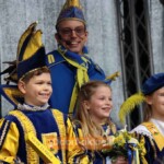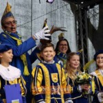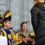 Kurz nach 13 Uhr war es dann endlich so weit und alles ging ganz schnell. Aus dem Schüler Robert Wewers wurde mit Kappe und Pritsche Prinz Robert I. und aus Frieda Küthe seine Venetia Frieda I. . Als Pagen standen Leni und Christoph bereit, die gemeinsam mit den frischgekürten Tollitäten den Karnevalisten zujubelten. Dass das Kinderprinzenpaar ein tolle Session erleben wird, wurde bereits deutlich, als die beiden gemeinsam ihre erste Rede mit Bravour meisterten. Beide gehen in die vierte Klasse der Friedrich-von-Spee-Schule und wurden von ihren Klassenkameraden als neues Kinderprinzenpaar gewählt. Schulleiterin Martina Schwenk war die erste Gratulantin und überreichte symbolisch den Schlüssel der Schule an Venetia Frieda.