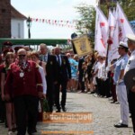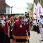 Doch neben den Schützinnen gab es in Kaiserswerth nach der langen Wartezeit endlich den Höhepunkt der Amtszeit der Majestäten. Und dabei sah man Rot, denn das dunkle Rot des Tambour-Corps Barabarossa dominierte. Regimentskönig Gregor Henrichs ist erster Vorsitzender des Tambour-Corps und trug selbstverständlich seine Uniform. An seiner Seite Regimentskönigin Michaela Henrichs in einem wunderschönen Kleid in passendem Rot und auch die beiden Hofdamen ergänzten in Kleidern Ton in Ton. Zur Familie gehört Sohn Jan Henrichs in Uniform, ebenfalls TC Barbarossa, als Schülerprinz. Dann war da noch Kronprinz Daniel Baumgarten, der das Trio der Barbarossa-Majestäten komplettierte. Er wurde von Johanna Bretz begleitet, die mit Kleinschützenkönigin Aniko Dorn und deren Begleitung Ian für farbliche Abwechslung sorgte.