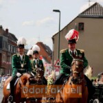 Auf der Fährstraße stellten die Schützen sich auf und zogen begleitet von zahlreichen Musikgruppen durch den Ort. Es war der Höhepunkt einer langen Amtszeit für das Regimentskönigspaar Stefan und Katharina Leuchten. Um so mehr genossen sie die Fahrt in der Kutsche, begleitet von ihrem kleinen Sohn und der Nichte. Auch das Jungschützenpaar Stefanie und Christian Becker strahlte in einer Kutsche mit der Sonne um die Wette.