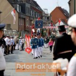 Nach dem Festzug begrüßten die Majestäten ihre Ehrengäste aus Politik, Gesellschaft und den befreundeten Schützenvereinen. Angeführt von den vielen prächtigen Blumenhörnern und den Pagen schritten Majestäten und Gäste auf der Hammer Dorfstraße die Reihen der angetretenen Schützen ab, um anschließend die Parade vor der St. Blasius Kirche anzuschauen. Dort hatten sich viele Zuschauer versammelt.