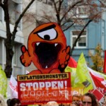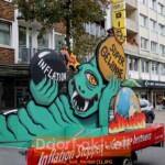 Der Platz vor dem Startpunkt vor dem DGB-Haus auf der Friedrich-Ebert-Straße wurde am Samstagmittag (22.10.) schnell knapp, denn immer mehr Demonstrierende strömten vom Hauptbahnhof und den aus ganz NRW eintreffenden Bussen herbei. Angeführt von dem von Künstler Klaus Klinger kreierten Inflationsmonster rückte die Demo um 12 Uhr bis zur Oststraße auf, um dann eine halbe Stunde später über Steinstraße, Kö und Graf-Adolf-Straße in Richtung Landtag zu ziehen.
