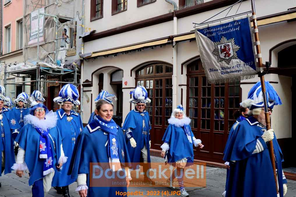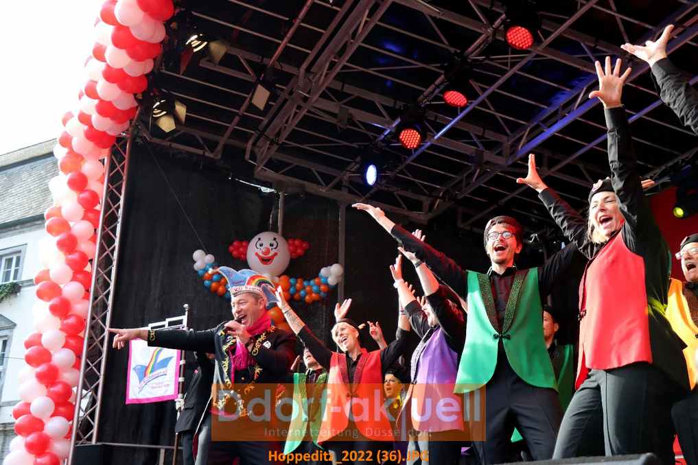 Mit der KG Regenbogen, der Prinzengarde der Stadt Düsseldorf Rot-Weiss, der Rhytmussportgruppe, der Prinzengarde Blau-Weiss, den Swinging Funfares, Alt Schuss, De Fetzer, Kokolores, der Jolly Family, Heinz Hülshoff, De Rhingschiffer, der Michael Hermes Band und der Werstener Music Company wurde bis in den Nachmittag gefeiert, geschunkelt und getrunken. Unter die Feiernden in der Altstadt mischten sich auch immer mehr Fußball-Fans, da die Fortunen am Abend den 1. FC Kaiserslautern zu Gast haben.