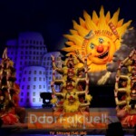 Im Saal erwartete die Jecken ein neues Tilly-Bühnenbild, bei dem in 3-D-Optik einige Wahrzeichen der Stadt abgebildet sind und das Motto von einer großen Sonne leuchtet. Eine andere Anordnung der Tische, mit schrägen Reihen Richtung Bühnen, ermöglichte allen eine gute Sicht. Immer wieder wanderten die Blicke auch in die Mitte des Saals, wo eine kleine Runde Bühne errichtet war. Dort eröffnete Sänger Max Weyers den Abend gemeinsam mit der KG Regenbogen und den Swinging Funfares mit dem Mottolied „Wir feiern das Leben“.