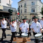 Der Festzug und die Parade des St. Sebastianus Schützenvereins in Düsseldorf Wersten am Sonntag (11.6.) waren ein äußerst prächtiger Anblick – trotz der Temperaturen über 30 Grad, was allen zu schaffen machte. Sechs Kutschen mit jeweils zwei Pferden, insgesamt 28 Pferde mit Oberst, Offizier- und Amazonencorps, Reiterkorps sowie die Elektrokutsche Ecarrus und zahlreiche Musikgruppen begleiteten den Schützenumzug. Allerdings hörten einige Zuschauer*innen, die sich ein schattiges Plätzchen am Straßenrand gesucht hatten, die Musik nur von Ferne. Denn durch die Hitze war der Weg verkürzt worden und der Zug kam deshalb nicht überall wie gewohnt vorbei.