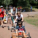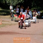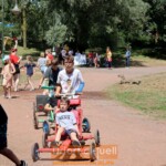 Bevor im Düsseldörfchen am Mittwoch (12.7.) das Abschlussfest gefeiert wird, stand am Dienstag (11.7.) alles im Zeichen des Renntags. Denn im Autowerk waren in den vergangenen Tagen zahlreiche Seifenkisten gebaut worden. Diese traten nun besetzt mit Zweiterteam gegeneinander an. Mitten durch das Düsseldörfchen und auf einem Kurs drumherum war die Rennstrecke mit Flatterband abgesperrt. 15 Seifenkisten der Kinder wollten starten. Zuerst gab es eine gemeinsame Runde hinter dem Safety-Roller, bei dem nochmal die schwierigen Stellen der Route erklärt wurden.