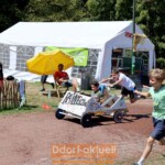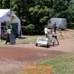 Das DRK positionierte sich an der schärfsten Kurve, um im Notfall schnell vor Ort zu sein. Und dann ging es Schlag auf Schlag. Vom Start ging es durch das Zelt des Autowerks hinunter zur Wiese, wo die Teams mit einer Wasserwand klar kommen mussten, die durch Gartenschlauch und zahlreiche Wasserpistolen erzeugt wurde. War die Strecke bis hierhin abschüssig, wurde es dann anstrengend, denn bis zum Ziel mussten die Anschieber viel leisten. Am Streckenrand jubelten die Kinder den Rennfahrer*innen zu. Zwei Runden absolvierten alle Teams. Die Zeiten wurden dann addiert und so die Sieger ermittelt.