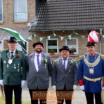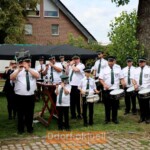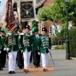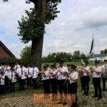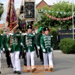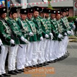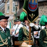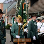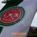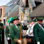 Zum Wecken am Sonntag war es noch trocken, aber schon bald stand fest, dass sowohl Festzug als auch Parade nicht wie geplant stattfinden können. Die Schützen nahmen es locker und verlegten beides ins Festzelt. Dort zogen die Gesellschaften zwei mal an den Majestäten und Ehrengästen vorbei – zum Festzug und gleich im Anschluss zur Parade. Dabei zeigten die Löricker Schützenfreunde ihr Jubiläumsschild und eine sehr schönes Blumenhorn, denn die Gesellschaft feiert ihren 50. Geburtstag.