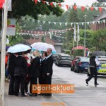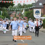 So war zumindest der Plan. Da es am Samstagnachmittag regnete, beschlossen Brudermeister Thomas Harry Strecker und sein Team etwas abzuwarten, um möglichst trocken zu ziehen. Doch als es dann zum Abschreiten der angetretenen Schützen auf dem Rheinweg ging, öffnete der Himmel so richtig seine Schleusen. Die Majestäten fuhren in geschlossenen Kutschen, wer einen Schirm hatte, versuchte halbwegs trocken zu bleiben, aber die Musiker*innen wurden klatschnass. Der Festzug ging auf direktem Weg ins Festzelt, die Parade fiel aus. Aber in Wittlaer ist man flexibel und so feierte man im Zelt und bis zum Königsball am Abend waren auch alle wieder trocken.