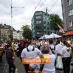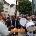 Denn der Sonntag machten allen Planungen einen Strich durch die Rechnung. Oberst Axel Uebels musste sich mit einer Unwetterwarnung auseinandersetzen. Zügig wurde entschieden, dass die Sicherheit der Schützen, Gäste und Zuschauer*innen Vorrang hat. Nach einer improvisierten Serenade der Musikzüge vor der Bilker Kirche griff Uebels zum Mikrofon des Polizeiwagens und informierte alle über den Außenlautsprecher, dass es keinen Festzug geben werde. Stattdessen wollte man die Parade zeitnah abhalten, um halbwegs trocken davon zu kommen. Da blieb keine Zeit für das traditionelle Abschreiten der angetretenen Schützen oder dem Aufmarsch der Fahnen der Gesellschaften.