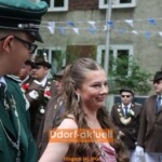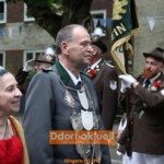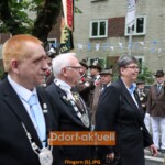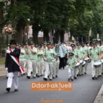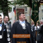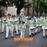Die Musiker*innen des Fanfaren-Tambourcorps 08 waren sicherlich nicht traurig darüber, dass das Wecken am Sonntagmorgen aufgrund des Regenwetters abgesagt wurde. Sie gestalteten mit den anderen Gruppen am Mittag den musikalischen Frühschoppen im Festzelt, bevor es dann zur Aufstellung zum Festzug auf dem Hellweg ging. Dort begann der Höhepunkt für die amtierenden Majestäten. Gemeinsam mit dem Vorstand schritten das Regimentskönigspaar Ralf und Ute Nitschke, Jungschützenkönigin Kimberley Peter mit ihrem Prinzen Jean-Pierre Kurschat, Schülerkönig Meiko Giesen mit Katharina Uhlmann an seiner Seite und Pagenkönigin Mia Kairies die Reihen der angetretenen Schützen ab. Leider begann zeitgleich ein leichter Regen, so dass es für sie in geschlossenen Kutschen zum Festzug ging. Doch bereits bei ihrer Ankunft an der Liebfrauenkirche war es wieder trocken und mit zahlreichen Ehrengästen genossen sie die Parade.