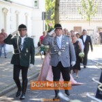 Zuvor hatten die drei Bataillone eine große Runde durch den Stadtteil gedreht. Dabei kamen sie auch am Broichgraben bei Heike und Michael vorbei. Die überlebensgroßen Strohpuppen zu Ehren des Klompenkönigspaares waren eine Überraschung der Wildschütz-Kompanie zum 100-Jährigen. Heike trägt ein Dirndl, Michael eine imaginäre Lederhose – mehr als zwei Stunden Handarbeit waren nötig, um das Strohdouble des echten Klompenkönigspaares an den Rand einer Wiese zu stellen. Wenige Schritte weiter und unmittelbar neben der Pfarrkirche St. Hubertus ging der Blick der einheimischen Schützen nach links zu einem rußumrandeten Fenster empor: Hier hatte ein Küchenbrand wenige Tage zuvor für einen Einsatz der Feuerwehr gesorgt.