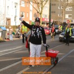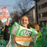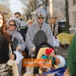 Ganz vor ging der Närrische Schutzmann, der den Zug mit seiner Glocke und Helau-Rufen ankündigt. Ulrike Hora erzählt die Geschichte hinter der Führungsfigur: Es handelte sich um den Sohn des langjährigen Organisators des Zuges, Siggi Meuter. Er war nach kurzer, schwerer Krankheit vom Montag zuvor verstorben. Nun gingen sein Sohn und die Enkeltochter vorweg, während Siggi von einer Wolke aus Konfetti aus zusah.