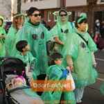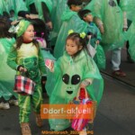 Um Punkt 11 Uhr setzte sich der jecke Lindwurm am Jungen Schauspielhaus, Münster Straße 446 in Bewegung. Während von hinten die besagte Weltraumcrew an schon, wuselten gleich vorn im Zug giftgrüne Aliens mit großen mandelförmigen Augen durch die Straßen. Viele hunderte Schaulustige probierten vorsichtig, was die Fremden von einem anderen mitgebracht hatten. Es entpuppte sich als Süßes und eroberte die Herzen und Gaumen aller beim Mörsenbroicher Veedelszoch. Der Japanische Kindergarten – klein wie groß – hatte sich als Außerirdische verkleidet und geschminkt – und machte den Karnevalszug, der aus der Zukunft kam, perfekt.