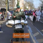 Vier Gruppen aus Rath, fünf Gruppen aus Mörsenbroich hatten sich eingefunden, um mit Helau und Kamelle die feiernden Menschen am Straßenrand zu unterhalten. Mit dabei waren wieder die Gartenzwerge aus dem Faselbusch, die alljährlich und bei jedem Wetter das Beet der Mörsenbroicher Karnevalsbegeisterung bestellen. Musikgruppen aus Essen Schonnebeck und die Landknechte aus Bochum sorgten für den Marschrhythmus im Zug.