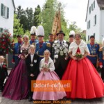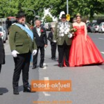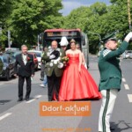 Ihnen zu Ehren waren die Schützen am Sonntagnachmittag (4.5.) an der Vennhauser Allee angetreten. Nachdem Oberst Christian Marks Meldung gemacht hatte, schritten die Majestäten gemeinsam mit Schützenchef Herbert Koch die Reihen ab, um dann in ihren Kutschen Platz zu nehmen. Königin an der Seite von Marcus Fuchs war Melanie Wüster. Ihr rotes Kleid war perfekt abgestimmt auf das magenta-farbene der Jungschützenkönigin Johanna – was sich erklärte, denn es sind Mutter und Tochter. Allerdings hatten auch beide mit ihrer Schleppe zu kämpfen – die die Herren an ihrer Seite nicht immer im Blick hatten und drauftraten. Pünktlich zum Festzug kämpfte sich auch die Sonne immer wieder durch.