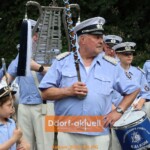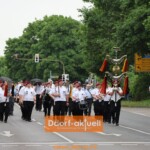 Allerdings hatte das Wetter kein Erbarmen. Beim Weg durch das Unterdorf regnete es so stark, dass die Parade kurzerhand gestrichen wurde und alle schnell in Richtung Festplatz abbogen. Kurz wurde noch diskutiert, ob eine Parade im Zelt Sinn machen würde, aber die Majestäten verzichteten, da die Schützen kaum noch eine trockene Faser am Leib hatten. So unterhielten die Musikzüge Tambourcorps “Frisch auf” Kalkum, der TC Barbarossa sowie die Kapellen Stein und Bendels mit einigen Stücken, bevor es locker ins Abendprogramm überging. Als Überraschung für die Majestäten gab es noch einen Auftritt der Rhine Area Pipes & Drums.