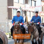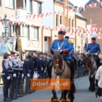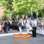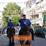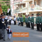 Das Tambourcorps war am Sonntagmorgen als erstes auf den Beinen, denn ab 8 Uhr war Wecken angesagt. Nach dem Frühschoppen auf dem Schützenplatz war dann der große Moment für das Regimentskönigspaar Gerd und Ilona Wächter sowie das Jungschützenkönigspaar Nils Hoffmanns und Lena Stoffels gekommen. Nachdem sie mit dem Vorstand und zahlreichen Ehrengästen die Reihen der angetretenen Schützen auf der Abteilhofstraße abgeschritten waren, ging es bei bestem Schützenwetter zum Festzug durch Volmerswerth und über den Rheindeich. Anschließend wurde die Parade abgenommen, bei der es viel Beifall für die Schützen gab – auch für deren Stechschritte.