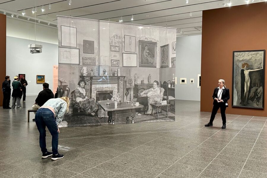In der Pariser Bohème der 1920er-Jahre war es fast schon schick, queer zu leben. Die amerikanische Literatin und Mäzenin Gertrude Stein („Rose is a rose“) und ihre Freundin Alice B. Toklas führten einen legendären Salon. Wie die Damen, von Kunst umgeben, am Kamin sitzen, zeigt der im Raum schwebende Großdruck eines berühmten Fotos von Man Ray aus dem Jahr 1922. Sinnbild der „Sapphischen Moderne“, zu der auch Romaine Brooks gehörte, die ihre Geliebte, die russische Ausdruckstänzerin Ida Rubinstein, 1914 als „Traurige Venus“ malte: ein Akt am Fenster in düsterer Nacht. 1920 folgte ein symbolistisches Bildnis der extravaganten Marchesa Luisa Casati als schönes bleiches Gespenst in einer Felsengrotte.