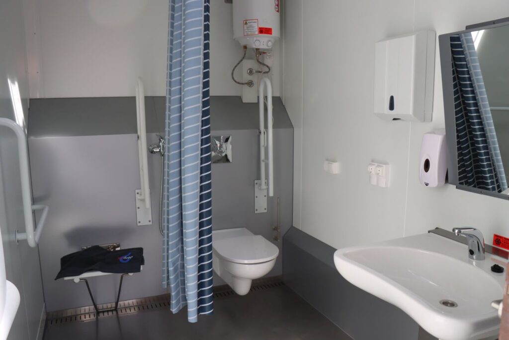 Ein Sprinter fährt den Duschanhänger an die verschiedenen Standorte. Im Sprinter kann auch Beratung stattfinden.