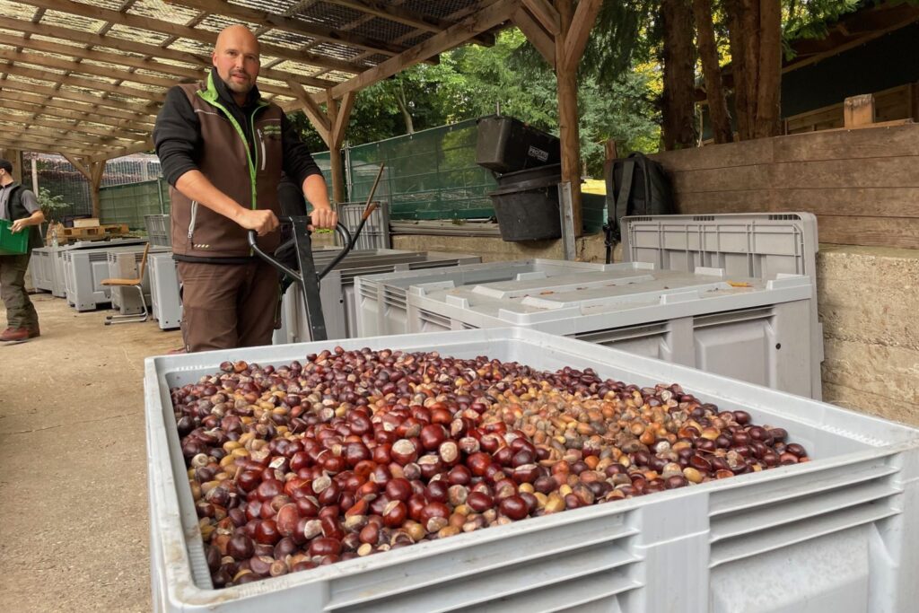 Beim ersten Termin lief es sehr gut für die Wildparktiere. Mehr als acht Tonnen Sammelgut liegt bereits im Wildpark-Futterlager. „Ich habe mit viel gerechnet, weil es ein Mastjahr für bestimmte Baumarten gewesen ist“, berichtete Porsche. „Der letzte Winter war feucht, der Sommer hatte zwar Trockenperioden, aber es hat auch genug geregnet. So gibt es eben viele Eicheln und deren Qualität ist auch noch gut.“
