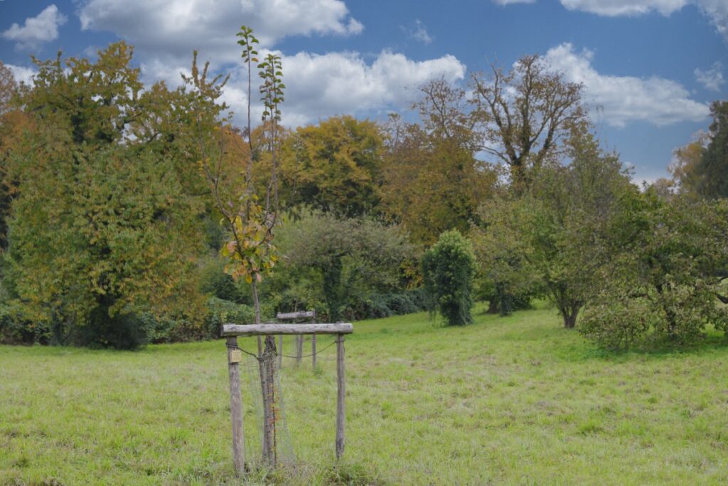 Zugegeben, mehr als ein Stämmchen und zwei Äste waren auf der neuen Düsseldorfer Hochzeitswiesen nicht zu sehen. Stützen sollen in den ersten Lebensjahren für die Standfestigkeit sorgen. Ein Messingschild verrät, wessen Apfelbaum der Sorte Cox Orange hier seine Wurzeln schlägt und irgendwann Früchte trägt. „Wir hoffen schon darauf, dass hier niemand Mundraub begehet, und wir von unserer Ernte auch was haben – sagen die beiden bei Foto mit Stammbaum – während die kleine Tochter im Kinderwagen den romantischen Moment noch nicht nachvollziehen kann und ihre Langeweile vernehmbar kund tut.