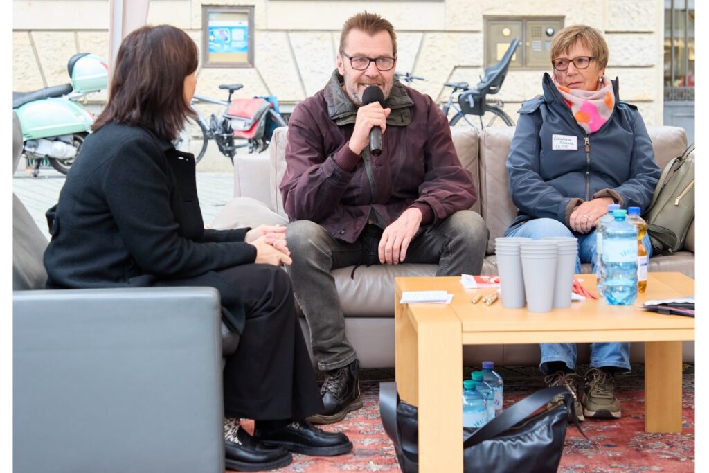 Caritas, SKM und SKFM Düsseldorf hatten am Freitag (17.10.) zur gemeinsamen Aktion „Armut in Düsseldorf überwinden – deine Ideen sind gefragt!“ auf den Schadowplatz eingeladen. Anlass war der Internationale Tag für die Beseitigung der Armut. Vor dem Haus der Universität hatten sie ein „Outdoor-Wohnzimmer“ aufgebaut, um dort mit Bürger*innen, Fachleuten und Interessierten ins Gespräch zu kommen.