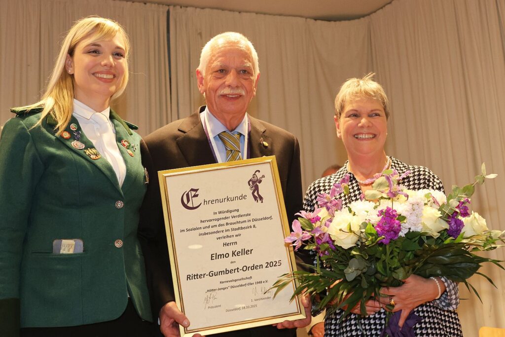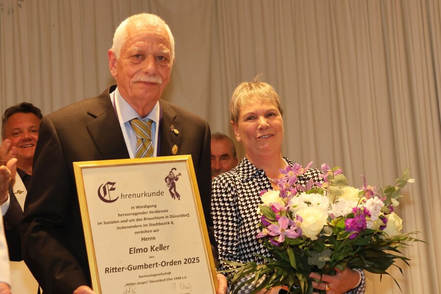 Bereits zum 45. Mal verliehen die Karnevalisten der Hötter Jonges am Samstag (18.10.) den Ritter Gumbert Orden. Ihn erhalten Persönlichkeiten, die sich im sozialen Bereich oder im Brauchtum im Stadtbezirk 8 verdient gemacht haben. Nachdem im vergangenen Jahr mit Lea Wagemans-Schmidt die erste Frau die Auszeichnung erhielt, trug sich in diesem Jahr Elmo Keller in die Liste der Geehrten ein.