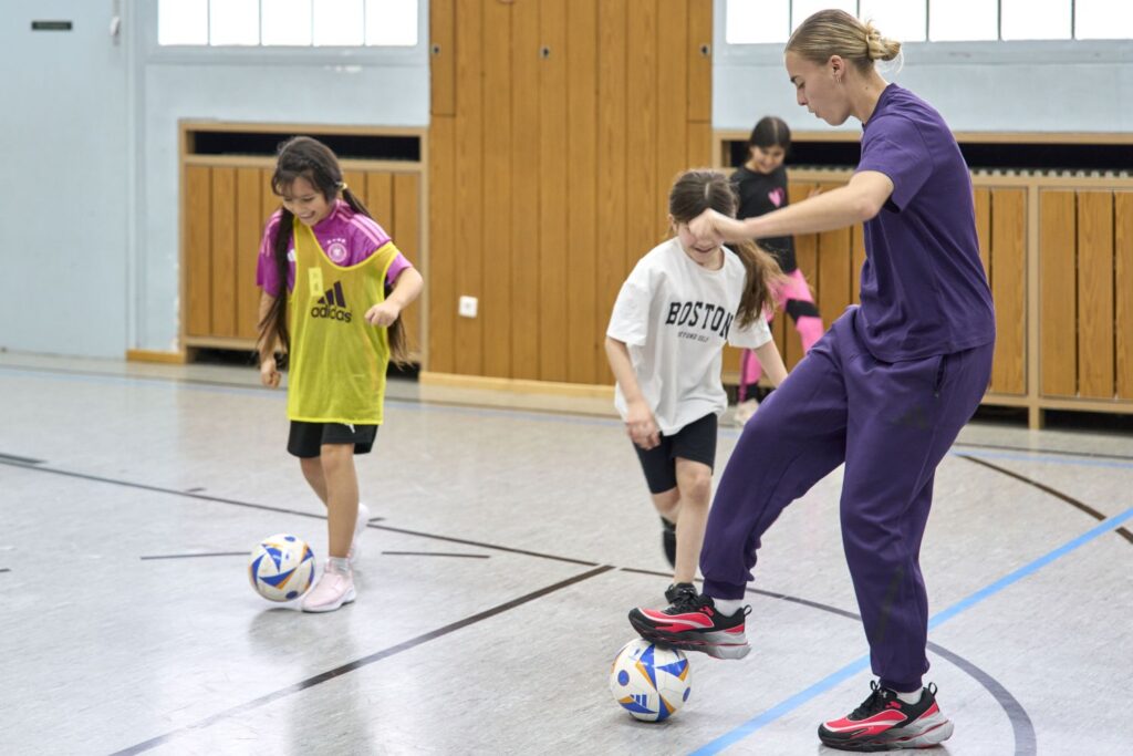 Mit großer Begeisterung empfingen sie drei Spielerinnen der deutschen Fußballnationalmannschaft der Frauen. Dabei erhielten die Schülerinnen nicht nur spannende Einblicke in den sportlichen Alltag von Laura Freigang, Cora Zicai und Laura Dick. In der Sporthalle kickten sie auch gemeinsam.