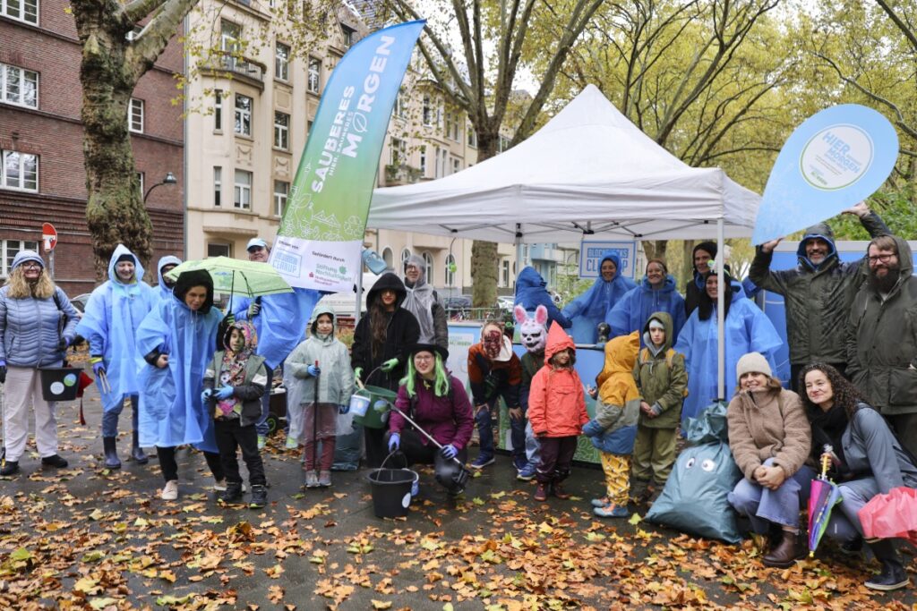 Gruppenbild mit Dauerregen: Als Familienaktion war das Müllsammeln in Bilk verbunden mit einer Schnitzeljagd – der Jagd nach den Müllgeistern.