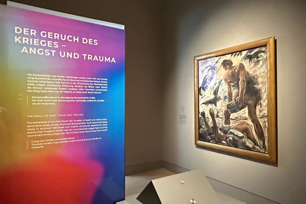 Mit 81 verschiedenen Duftstoffen an 29 Stationen hat Müller-Grünow gearbeitet. Da könnte die Nase schnell überfordert sein, man kennt das aus Parfümerien. Aber bei diesem Parcours vermischt sich nichts. Regenbogenfarbene Vorhänge trennen die Lüfte der einzelnen Bereiche, und die Räume werden nicht einfach besprüht. Düfte steigen von Kartuschen auf oder können individuell per Knopfdruck, in Flaschen, mit Flakons oder unter Schutzgläsern freigesetzt werden. Jeder schnüffelt, was gefällt. Oder interessiert. Denn, Achtung! Im Laufe des Rundgangs gibt es nicht nur angenehme Düfte. Der Krieg riecht diffus nach Blut und Schießpulver – an einer Station vor Lovis Corinths Brudermord-Bild „Kain“.