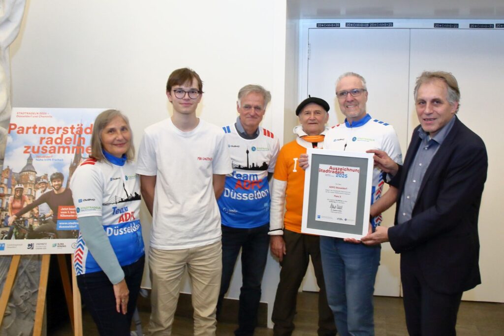 Vom 1. bis zum 21. September 2025 wurde im Rahmen der Aktion „Stadtradeln“ auch in Düsseldorf wieder fleißig in die Pedalen getreten und Kilometer gesammelt. Insgesamt nahmen 312 Teams mit 7.122 Radfahrer*innen teil. Die 20 erfolgreichsten Teams wurden am Mittwoch (29.10.) im Rathaus von Jochen Kral, Dezernent für Mobilität und Umwelt, mit einer Urkunde ausgezeichnet. Dabei wurde in diesem Jahr erstmals die Auswertung in anderer Form durchgeführt. Für die Auswahl der Siegerteams wurde ausschließlich die Gesamtauswertung herangezogen und damit auf eine Trennung in Sonderkategorien wie “Unternehmen”,”Schulen” oder “Verwaltung” verzichtet. Entscheidend waren allein die “Summe der gefahrenen Kilometer” und die “Kilometer pro Kopf”. Damit soll der Auswahlprozess vereinfacht werden und mehr Teams werden für ihr Engagement ausgezeichnet.
