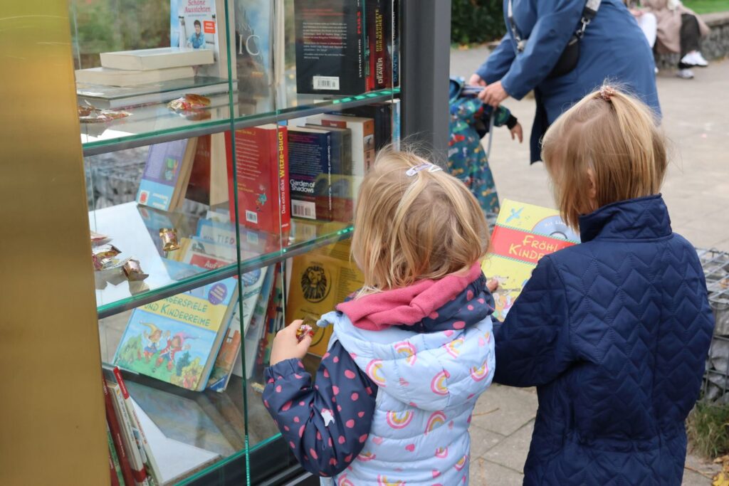 Am Freitag (31.10.) gab es allerdings in Vennhausen am Kinderspielplatz Veenpark eine Premiere. Dort wurde der 31. Bücherschrank feierlich enthüllt, aber es ist der allererste, der seinen Schwerpunkt bei Kinder- und Jugendbüchern hat. Der Standort zwischen Eisdiele und Spielplatz scheint dafür ideal. Petra Schilberg, Eva Schwaderlapp und Miriam Degutsch sind die Patinnen, die sich um den Schrank kümmern. Sie wohnen in der Nähe und sind gespannt, wie der Schrank angenommen werden wird und ob die Nutzer*innen sorgsam mit den Büchern umgehen.