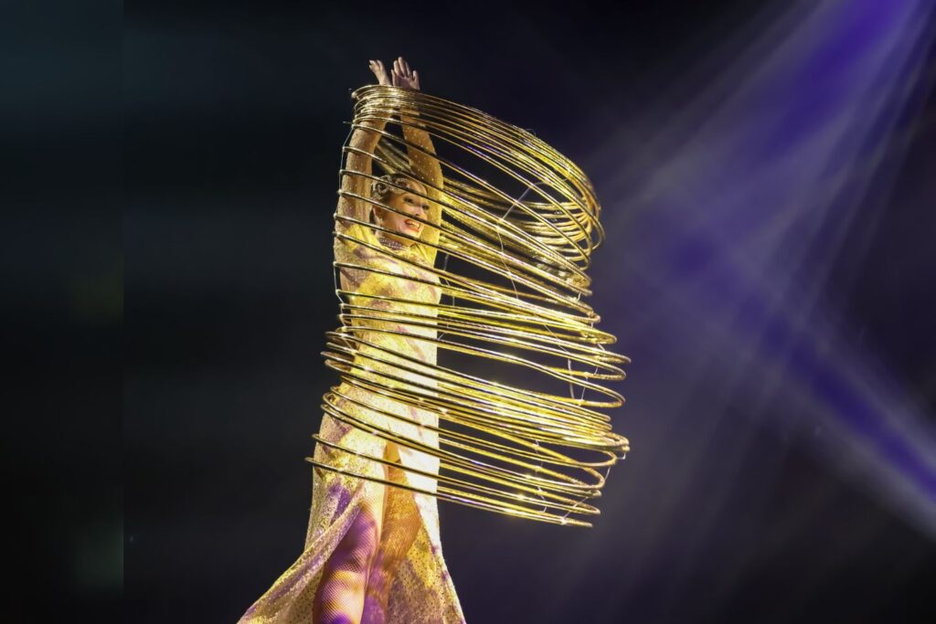 Was Taylor Montico mit ihren Hula-Hoop-Reifen präsentiert, beeindruckt die Gäste im Saal des Apollo. Mit jeder Drehung und jeder Bewegung lässt sie die Reifen in einem Spiel aus Eleganz und Dynamik kreisen. Damit verwandelt sie einen simplen Reifen in ein Instrument der Magie und schafft eindrucksvolle Momente.