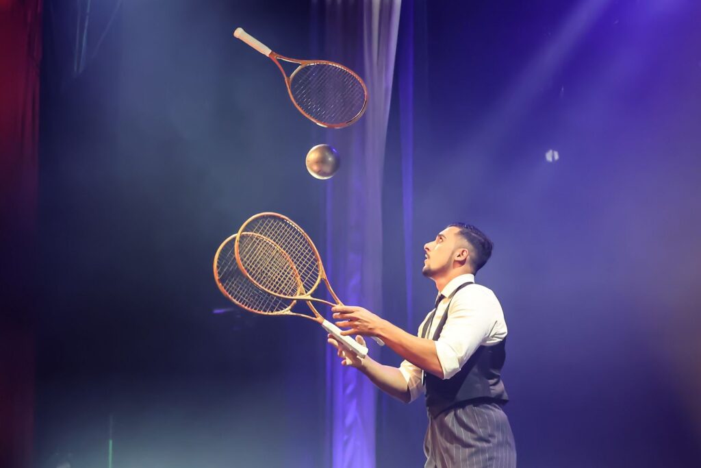 Dass man nicht nur mit Bällen oder Keulen jonglieren kann, zeigt Glenn Folco. Tennisschläger und eine Kugel lässt er durch die Luft wirbeln. Zur Musik „We no speak Americano“ hebt er die Jonglage mit unverwechselbarem Charme und atemberaubender Präzision auf ein neues Niveau.