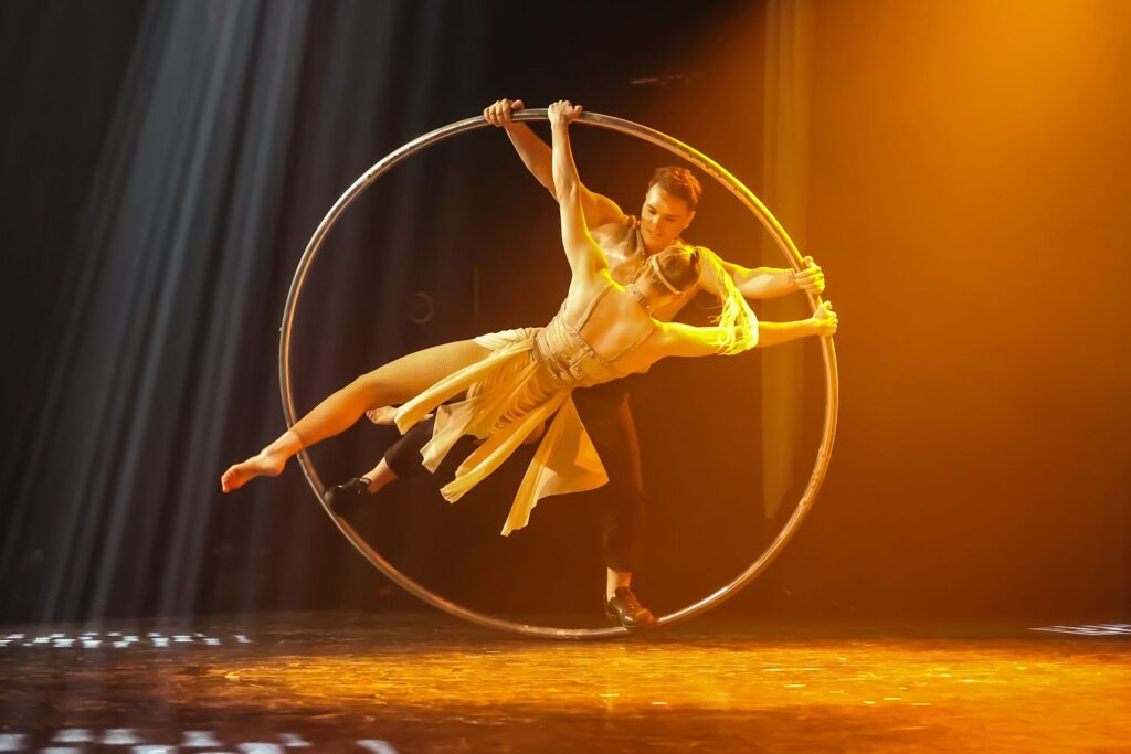 Mit dem Song „Don’t speak“ nicht ganz im Klang der 20-ger, aber passend zur traumhaften Show des Duo Crystal Circle, drehen sich Dominika und Mihaly scheinbar schwerelos auf ihrem übergroßen Rad um die eigene Achse. Ihre Darbietung am Cyr Wheel ist ein romantisches Spiel aus Stärke und Grazie, das auch noch einen Überraschungsmoment für das Publikum bereit hält.