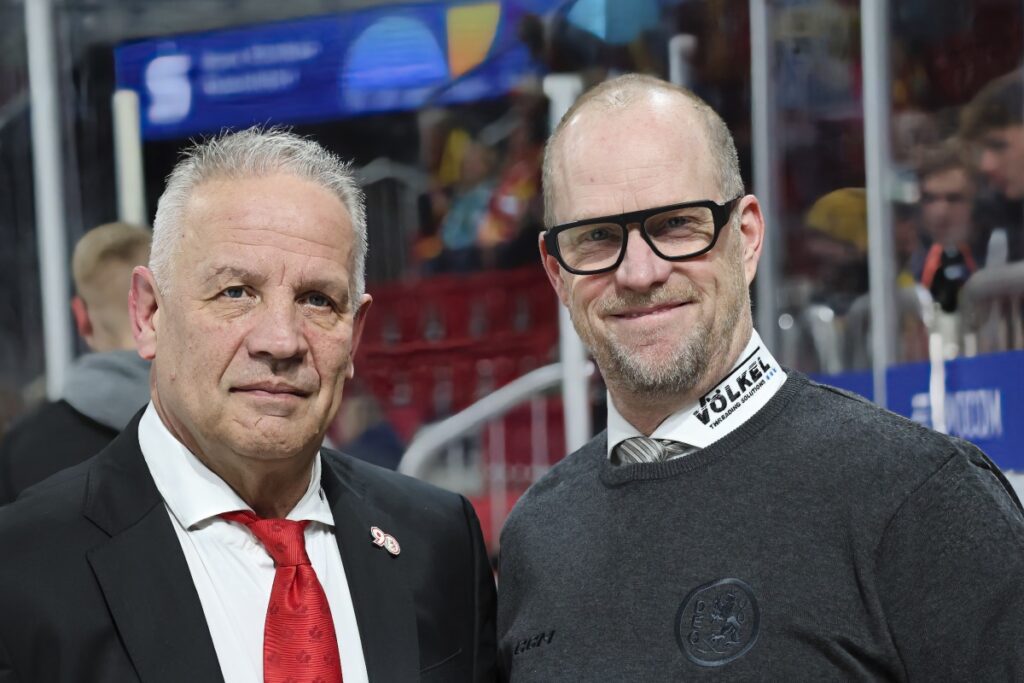 Trainer Rich Chernomaz (l.) musste drei Spieler ersetzen und gestaltete die Sturmreihen der DEG um. Foto: Karina Hermsen