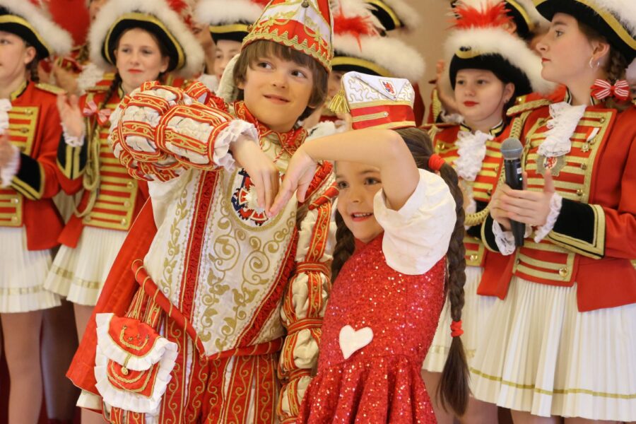 Dann war der große Moment für Moritz Jacob und Felicia Greta gekommen. Mit ihrem jungen Alter von 9 und 7 Jahren ist das Geschwisterpaar trotzdem bereits seit drei Jahren in der Kindergarde aktiv. Beide besuchen die Grundschule in Urdenbach und freuen sich sehr auf ihre Aufgabe. Dass sie das können, ist keine Frage. Hat doch Moritz Jacob bereits vor einem Jahr bei der Kürung von Nia und Justus-Julius bei der gemeinsamen Gesangseinlage mit den Rot-Weiss-Spatzen gezeigt, dass er sich nicht vor Auftritten scheut. Seine Schwester tanzt in der Garde.