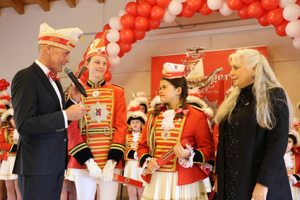 Gleich nimmt Präsident Dirk Kemmen Nia und Justus Julius ihre Insignien ab – rechts die Betreuerin der Kindergarde Petra Hautzer