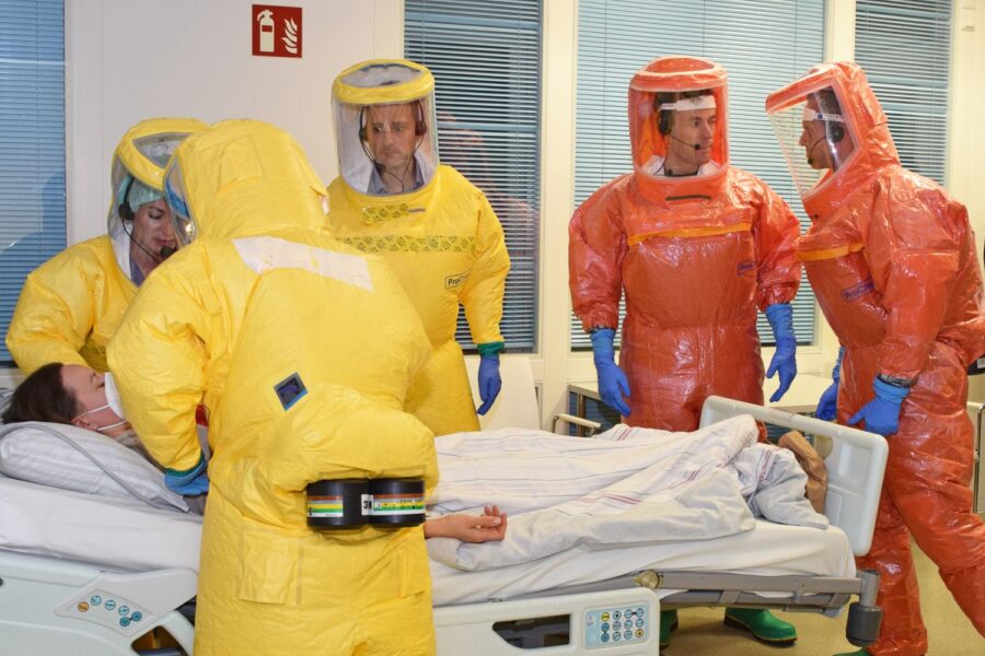 Um auf den Ernstfall vorbereitet zu sein und die Abläufe zu trainieren, führen die Düsseldorfer Feuerwehr, das Gesundheitsamt und die Sonderisolierstation der Uniklinik Düsseldorf regelmäßig Übungen durch, wie mit schwer erkrankten und hochinfektiösen Patienten umgegangen wird. Neben einer jährlichen Übung auf internationalem Niveau, vertiefen die Universitätsklinik und die Feuerwehr die Zusammenarbeit in rund 20 Übungen pro Jahr. Im Fokus steht dabei die Logistik und die detaillierte Planung zwischen allen Akteuren.