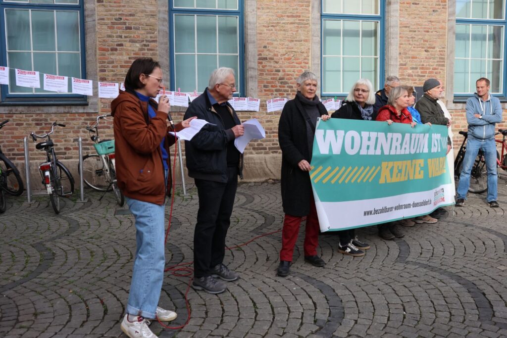 Die konstituierende Sitzung des Stadtrats am Donnerstag (6.11.) nutzen Vertreter*innen des Bündnis für bezahlbaren Wohnraum, um auf die gravierenden Probleme auf dem Wohnungsmarkt aufmerksam zu machen. Im Kommunalwahlkampf hatten verschiedene Parteien zugesichert, etwas an der Lage ändern zu wollen. Das Bündnis befürchtet, das es bei Versprechungen bleibt und fordert „kein weiter so in der Wohnungspolitik der Stadt“. Rund 1000 Unterschriften hatten sie bei Düsseldorfer*innen gesammelt, die damit drei wichtigen Forderungen Ausdruck verleihen wollten: