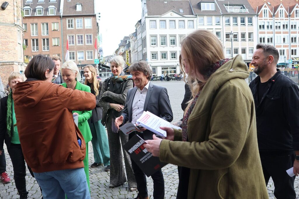 Vor dem Rathaus hatten sie zahlreiche der unterschriebenen Forderungen auf Leinen aufgehangen. Ziel war es, die Karten in der geplanten Mittagspause der Ratssitzung an die Mitglieder des Rats zu übergeben. Doch verschiedene Sitzungsunterbrechungen wegen Beratungsbedarf machte diesen Plan zunichte. Allerdings kamen trotzdem Vertreter*innen von Bündnis 90/Die Grünen, SPD, Linke und FDP, um das Gespräch mit dem Bündnis zu suchen. So konnten an Clara Gerlach und einige Ratsleute der Linken die Karten übergeben werden. Die AfD-Fraktion kam zwar geschlossen auf den Marktplatz, aber nur um ein Gruppenfoto zu machen. Die Aktion würdigten sie keines Blickes. Enttäuschend war auch, dass die für Wohnungsbau zuständige Dezernentin Cornelia Zuschke, wortlos am Stand vorbei eilte. Von der CDU suchte ebenfalls niemand den Kontakt.