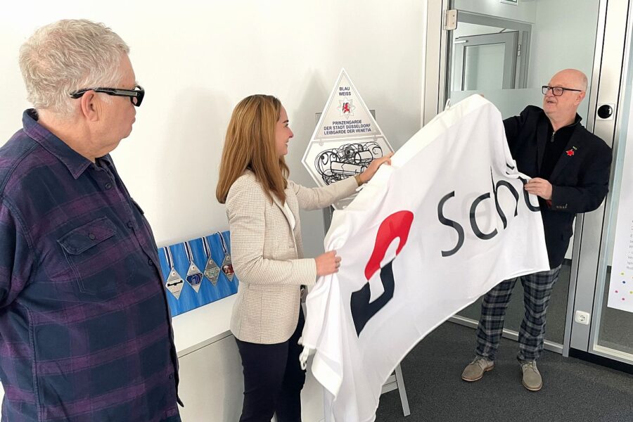 „Ich habe immer mit einfachen Dingen gearbeitet, habe meine Materialien aus dem Baumarkt geholt“, erläuterte Oehlen bei der Ordenspräsentation am Freitag (7.11.) in den Räumen der Schüssler Plan GmbH. „Ich will über eine rudimentäre Art von Zeichnung den Schwung, das Lebendige des Karnevals transportieren.“ Also nahm sich der Maler, Objektkünstler und ehemalige Professor an der Kunstakademie München drei Jecken vor, gab ihnen lange röhrenförmige Nasen, Augen aus den Griffen von Scheren und jede Menge wellenförmigem pulsierende Linien. „Dieses wirbelnde Leben ist für mich Karneval“, beschrieb Oehlen.