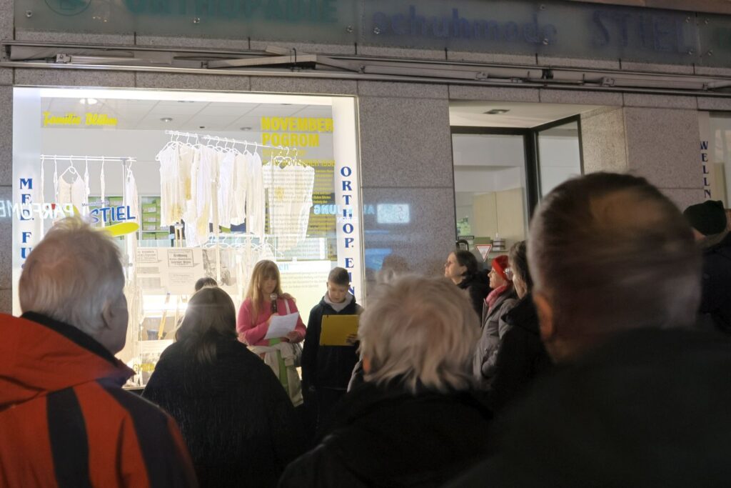 An fünf Stationen berichteten die Schüler*innen den rund 600 Teilnehmer*innen über die Familie Bluhm, Auguste Leven, Lutz Brasch und die Familie Hohenstein. Dabei blicken sie auf die Ereignisse während des Pogroms am 9. und 10. November 1938 und stellten die Schicksale der Menschen vor. Was passierte während des Angriffs auf Auguste Leven? Wie fühlte sich der 12-jährige Lutz Brasch nach dem Überfall? Und wer waren diejenigen, die angriffen, zerstörten und plünderten?