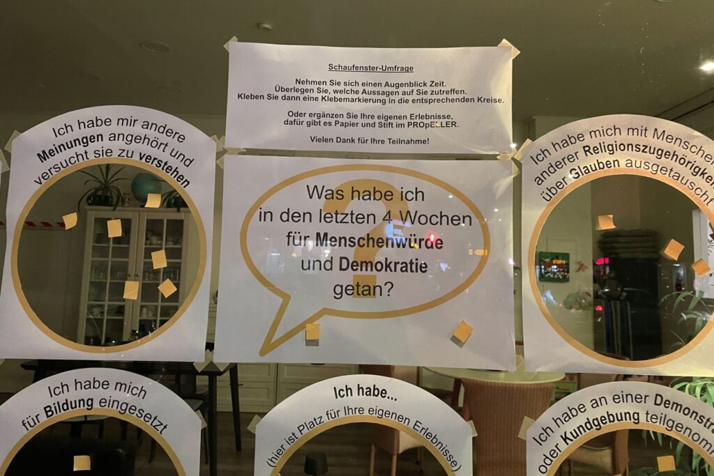 Einen besonderen Ansatz hat das Team vom Begegnungs- und Beratungszentrum PROpELLER an der Gumbertstraße 79 gewählt. Denn dort kann man sich an einem Schaufenster selber hinterfragen „was habe ich in den letzten 4 Wochen für Menschenwürde und Demokratie getan?“. Mit Klebepunkten können Interessierte ihre Aktivitäten dokumentieren oder werden angeregt, aktiv zu werden. Außerdem gibt es drei Termine, zu denen herzlich eingeladen wird: