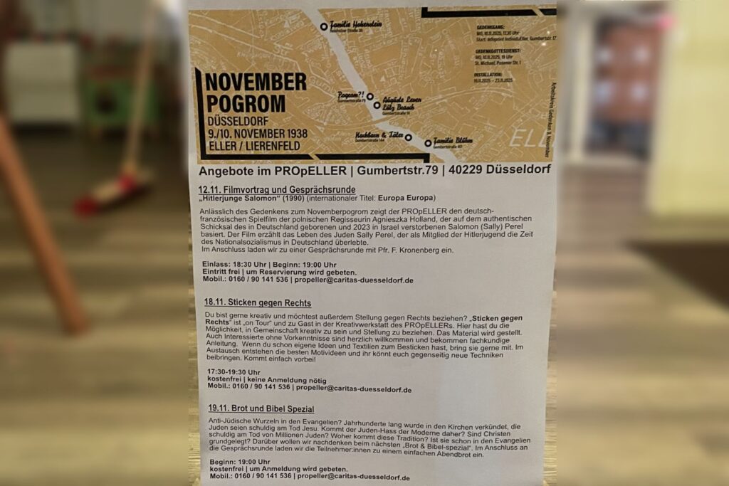 Jona Winstroth, Wissenschaftlicher Mitarbeiter der Mahn- und Gedenkstätte und Mitglied im Arbeitskreis Gedenken 9. November, verdeutlichte am Montag (10.11.) beim Gedenkgang zum Novemberpogrom, dass es kaum noch Zeitzeugen gibt, die die NS-Zeit erlebt und überlebt haben. Umso wichtiger sei es, das Gedenken zu bewahren und dies auch jungen Menschen zu vermitteln. Allein in Düsseldorf gab es während des Novemberpogroms mehr als 450 brutale Überfälle auf Menschen, die als Jüdinnen und Juden verfolgt wurden. Mindestens 70 Menschen erlitten Verletzungen und 13 starben während oder an den Folgen des Pogroms. Die Schicksale von Juden, die damals in Eller und Lierenfeld lebten oder arbeiteten, haben die Schüler*innen des Gymnasiums Bernburger Straße, des Lore-Lorentz-Berufskollegs, der Volker-Rosin-Grundschule sowie der Dieter-Forte-Gesamtschule recherchiert und für den Gedenkgang aufgearbeitet.