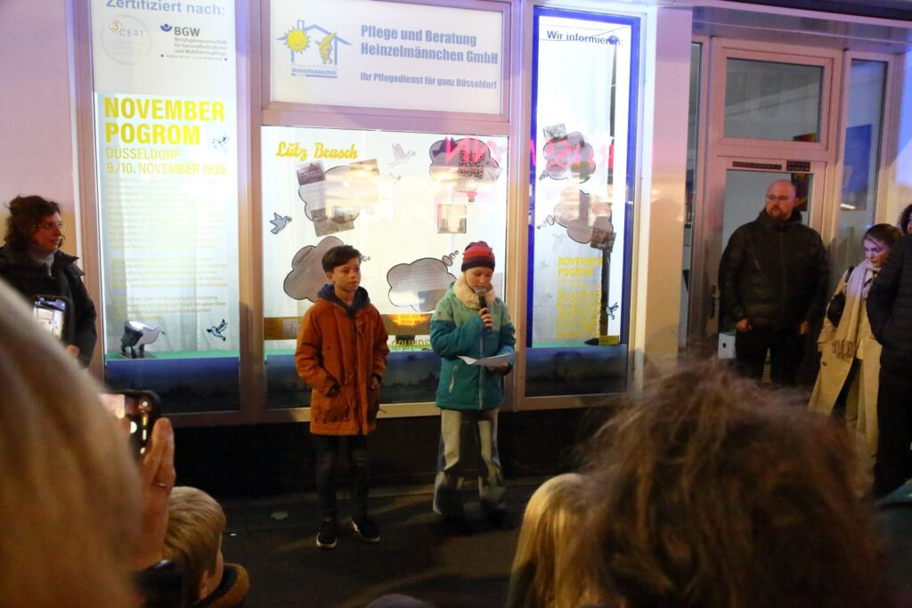 Die Schüler*innen erzählten von den jüdischen Nachbar*innen und erklärten die von ihnen gestalteten Schaufenster entlang der Gumbertstraße und der Reisholzer Straße. Die Schaufenster mit den Erläuterungen können noch bis zum 23. November besichtigt werden.