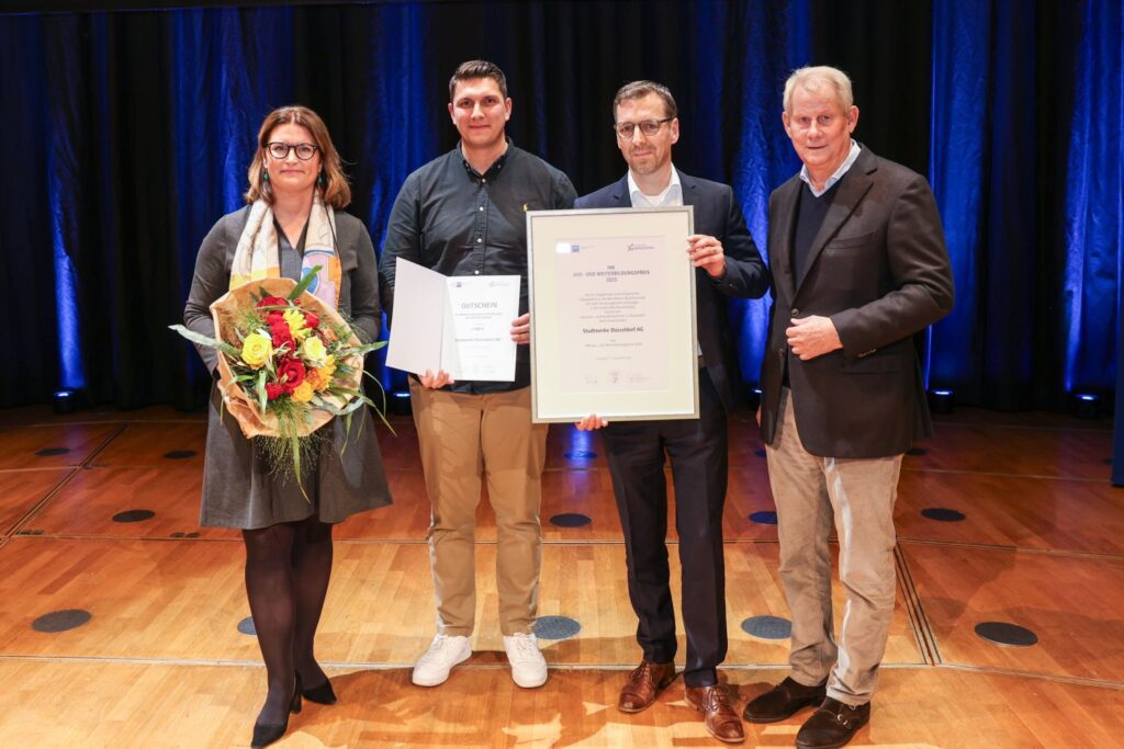 Mit dem IHK-Aus- und Weiterbildungspreis zeichnet die IHK seit 2010 jährlich ein Unternehmen mit Sitz im Bezirk der IHK Düsseldorf aus, das sich in besonderer Weise um die Aus- und Weiterbildung verdient gemacht hat. In diesem jahr erhielt den Preis die Stadtwerke Düsseldorf AG. Die Stadtwerke haben in den vergangenen 20 Jahren 679 Azubis ausgebildet, zurzeit absolvieren dort 85 junge Menschen eine Ausbildung. Die Qualität der Ausbildung zeigt sich auch dadurch, dass Azubis der Stadtwerke regelmäßig zu den IHK-Ausbildungsbesten gehören – auch in diesem Jahr waren gleich vier dabei. Das Unternehmen unterstützt die IHK außerdem bei den Prüfungen, indem es nicht nur 10 Prüfer*innen, sondern auch viermal im Jahr seine Ausbildungswerkstatt für die IHK-Prüfungen kostenlos zur Verfügung stellt. Die Arbeitsdirektorin der Stadtwerke, Dr. Charlotte Beissel, nahm in der Tonhalle die Preisurkunde und einen Weiterbildungsgutschein der IHK in Höhe von 2.500 Euro entgegen.