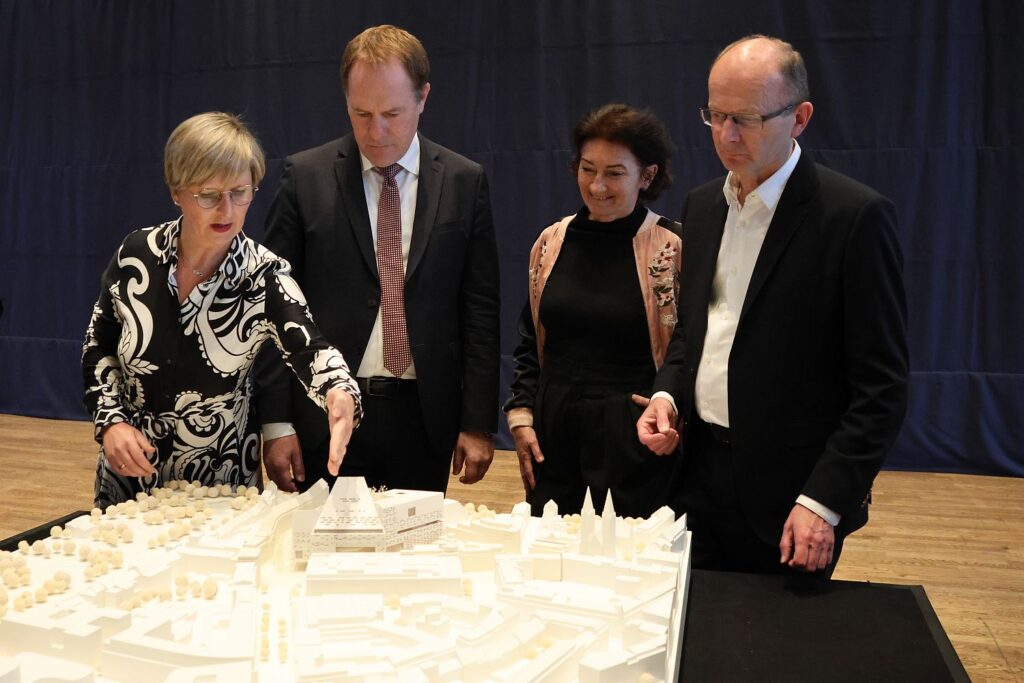 Opern-Chefin Alexandra Stampler-Brown, zeigt am Model ihre künftige Wirkungsstätte Oberbürgermeister Dr. Stephan Keller, Miriam Koch und Heiner Farwick