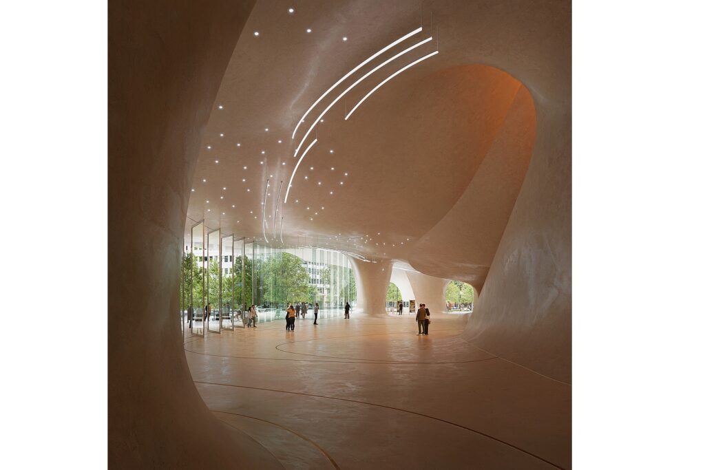 Der Siegerentwurf überzeugte auch durch die Gestaltung des weiträumigen Eingangsbereichs, Animation: Snøhetta Oslo AS