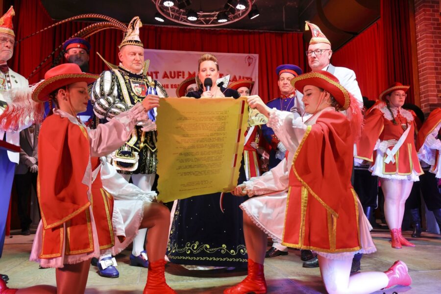 Nach der Übergabe von Narrenzepter und Rose und dem Austausch von Orden verkündete das neue Unterbacher Prinzenpaar seine elf närrischen Gesetze: Ob ein dreifaches Unterbach I-A im Bus bei der Station „Unterbach Friedhof“ – vor der Arztpraxis von Prinz Robert I., ein gebackener Kuchen in Eselsform oder eine baustellenfreie Zugstrecke: die Unterbacher Tollitäten hatten Forderungen in ganz unterschiedliche Richtungen. Und bekamen dafür viel Beifall. Zu ihrem Orden stellte das Prinzenpaar fest: „In diesem Jahr verleihen wir kein Edelmetall, sondern Eselmetall!“.